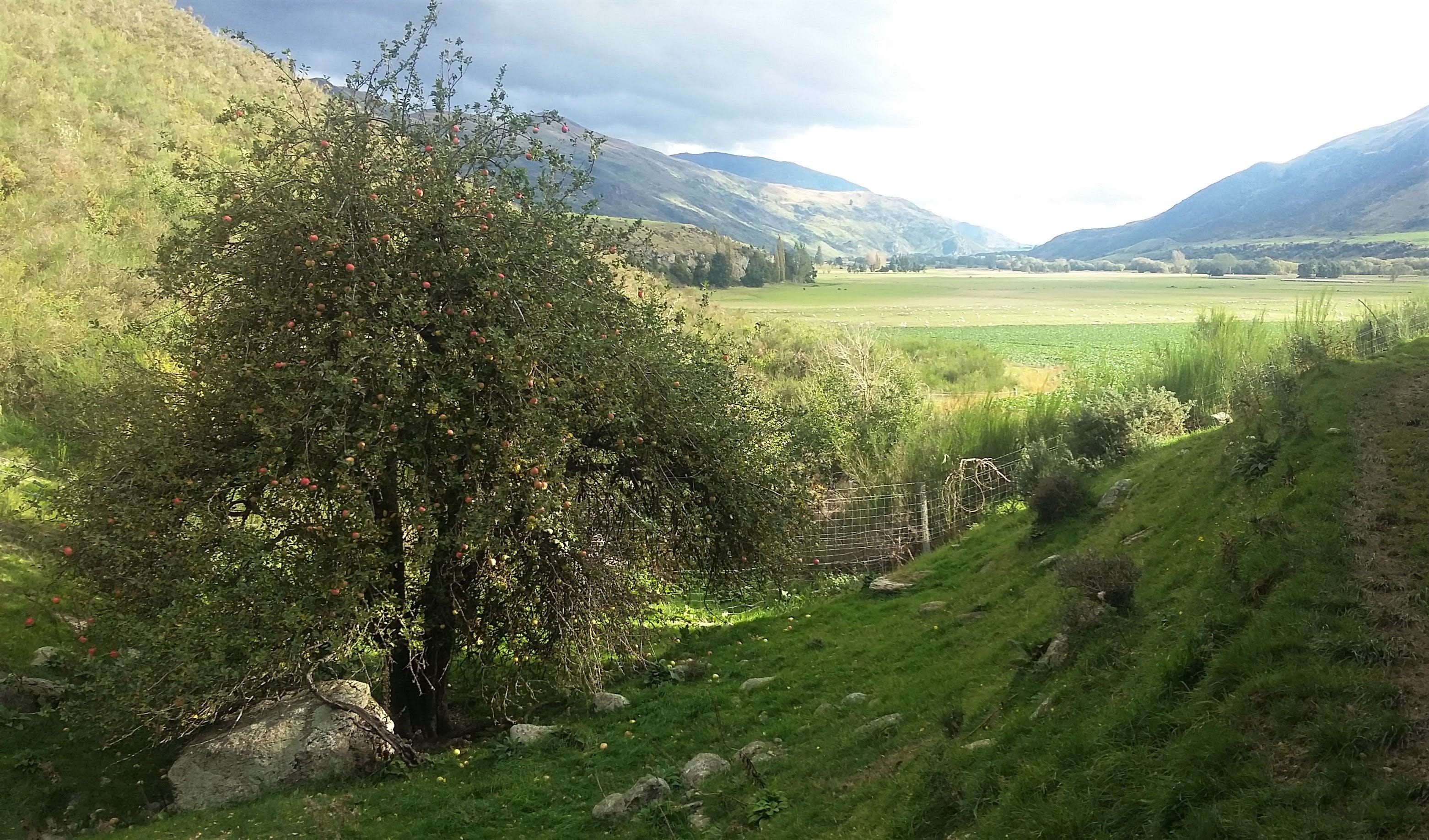 The now-dry creek used to wash down through the paddocks and home orchards on the terraces above. Perhaps an apple tumbled downstream, or a bird deposited a seed as it flew by?